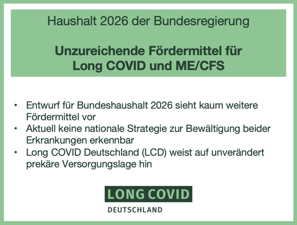 Hamburg/Berlin, 06.07.2022 – die Deutsche Gesellschaft für ME/CFS und Long COVID Deutschland (LCD) freuen sich, dass vom Bundestag am 12. Mai 2022 fünf Millionen Euro für Therapiestudien von ME/CFS und dem Post-COVID-Syndrom in den Haushalt für 2022 eingeplant wurden, mit der Aussicht auf weitere fünf Millionen Euro im Jahr 2023.